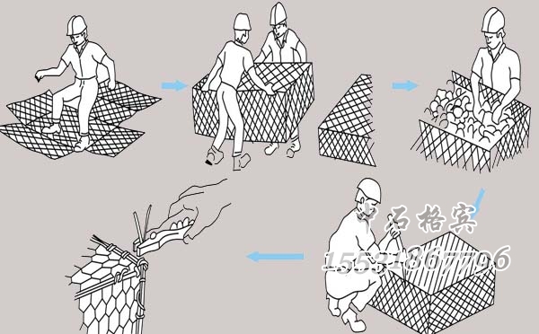 將折疊好的雷諾護墊沿坡面由下往上展開,壓平多余的折痕。將前后面板、底板、隔板立起到一定位置,呈箱體形狀。相鄰網箱組的上下四角以雙股組合絲連接;上下框線或折線,綁扎,并使用螺旋固定絲絞繞收緊聯結。由隔板分成若干單元格,為了加強網墊結構的強度,所有的面板邊端均采用直徑更大的鋼絲。將數件空雷諾護墊放置于平地,將其聯結在一起.在有下層網箱組的情況,綁扎上層網箱組間相鄰邊的底線框時,必須將下方網箱組面層框線或網片綁扎在一起,用螺旋固定絲攪擾收緊,以求連成一體。將網蓋向下折,拉到位并與前板、側板及隔板絞合在一起。用大約長于邊絲1.5倍的綁絲綁扎,所有的面板邊端均采用直徑更大的鋼絲。將相鄰網箱組的上下四角以單股或雙股組合絲連接,雙股間距不大于300mm。上下框線或折線,用綁絲螺旋固定絞繞收緊聯結綁扎,邊緣末端的間距最大為100mm,可用鉗子將綁絲固緊。綁扎時需注意保護網絲表層的涂層,不要將其損壞。